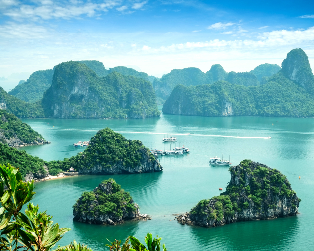 Enjoy a Vietnamese buffet lunch while cruising past iconic limestone formations